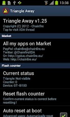 Many Samsung devices store a flash counter that keeps track of how many times you have flashed *custom* firmwares to your device. On some devices, a yellow triangle or other sort of visual warning is also displayed during boot if you are running a *custom* firmware. TriangleAway was built to disable the triangle (if a visual warning is present) and reset the custom ROM flash counter to 0. This app requires root !