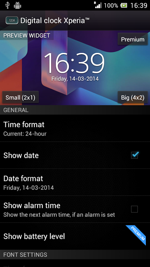 - Choose between small (2x1) and big (4x2) resizable digital clock widgets with 6 possible fonts
