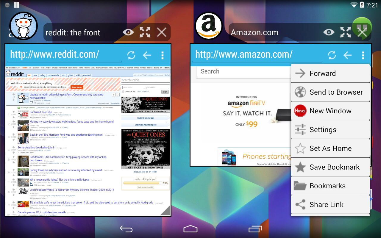 Whether it's viewing images of cats from reddit links, or opening articles from Google Now, Hover Browser is able to open and load the content quickly so you don't ever have to leave your current application.