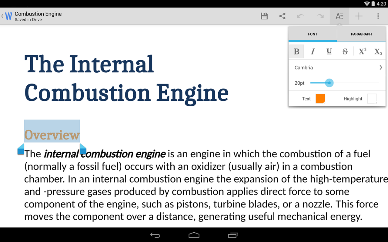 Overview: This app from Google lets you create and edit Microsoft® Office documents, spreadsheets and presentations on your Android phone and tablet.